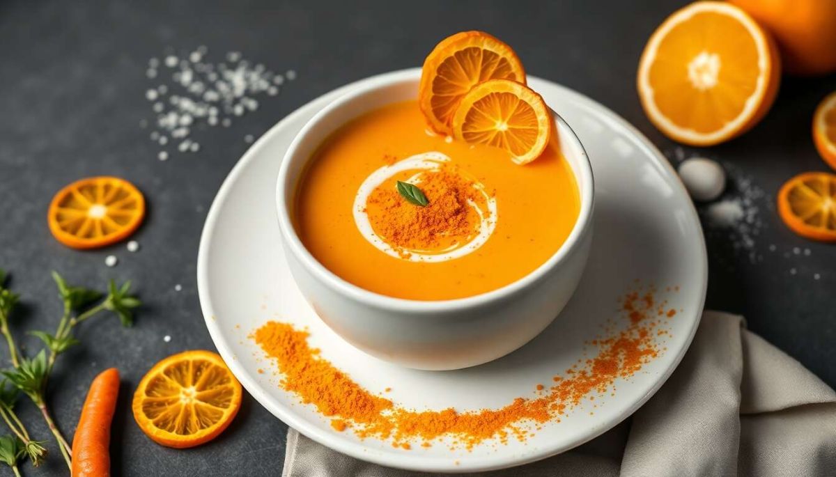 Pour servir, versez le velouté dans des bols, en décorant avec des brins de ciboulette séchée et un zeste d’orange pour un effet à la fois esthétique et gustatif. Utilisez une louche à bec verseur pour éviter les éclaboussures.